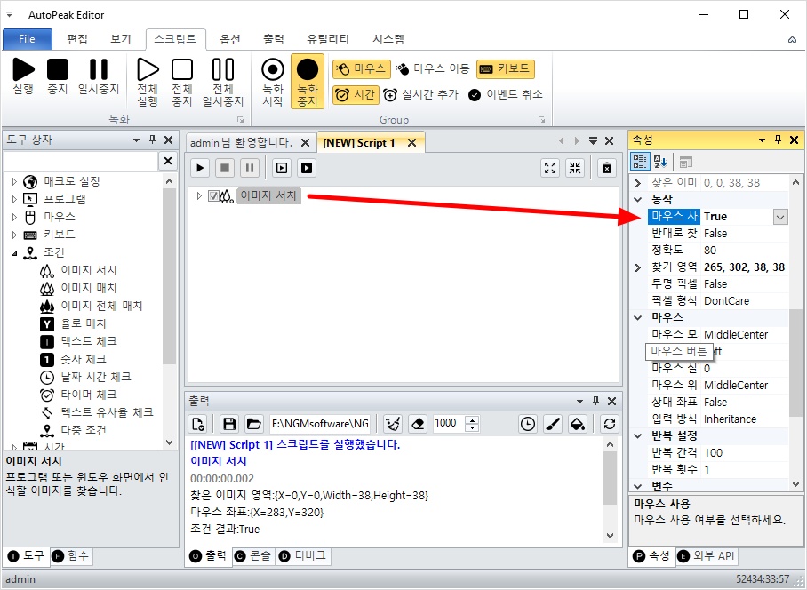 이미지 서치의 우측 속성창에서 동작 카테고리에 있는 마우스 사용을 True로 변경해줍니다.