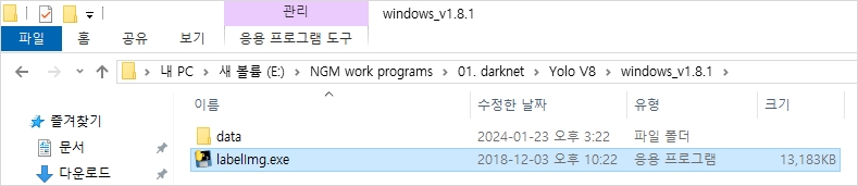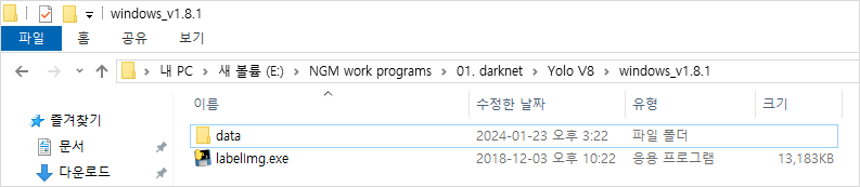 다운로드 받은 파일의 압축을 풀면 아래와 같이 data 폴더와 labelImg.exe 실행 파일이 있습니다.