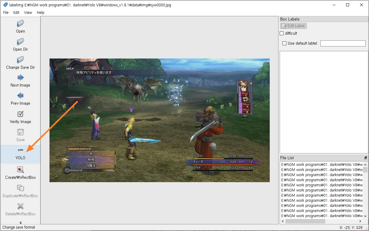 아래 화살표를 클릭해서 욜로로 선택해줘야 합니다. 여러분들은 아마도 PascalVOC로 되어 있을수도 있어요. YOLO로 변경해야 합니다.