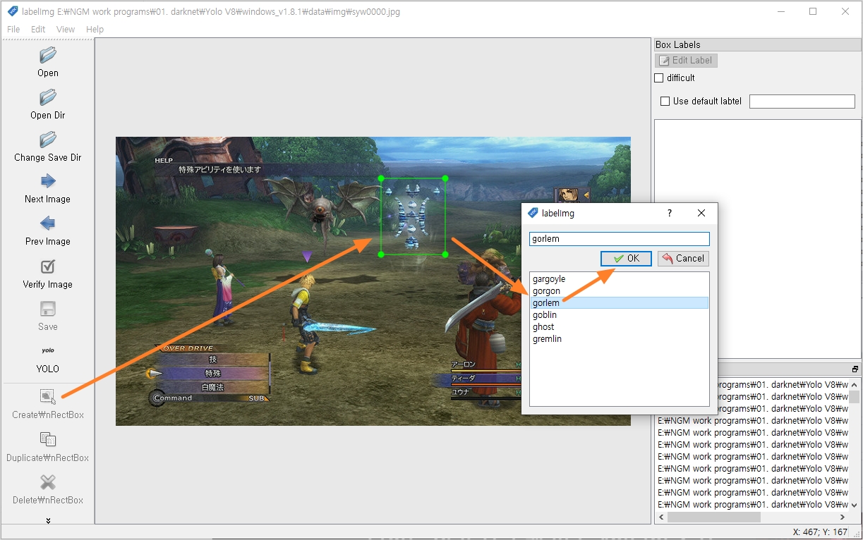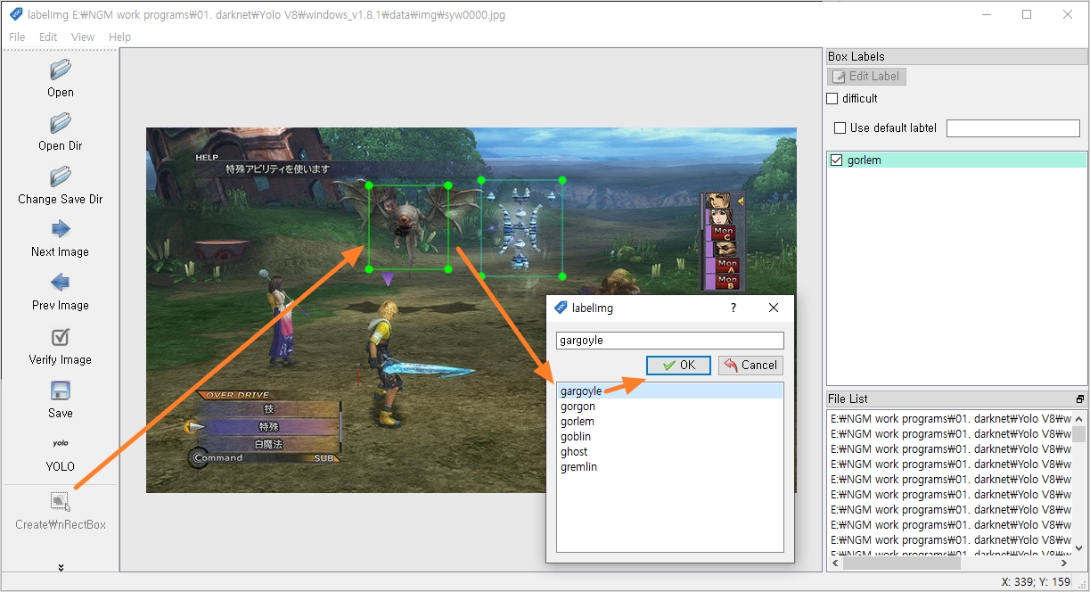 그러면 labelimg창이 표시되고, 이 몬스터의 이름을 선택하고 OK를 클릭하세요.