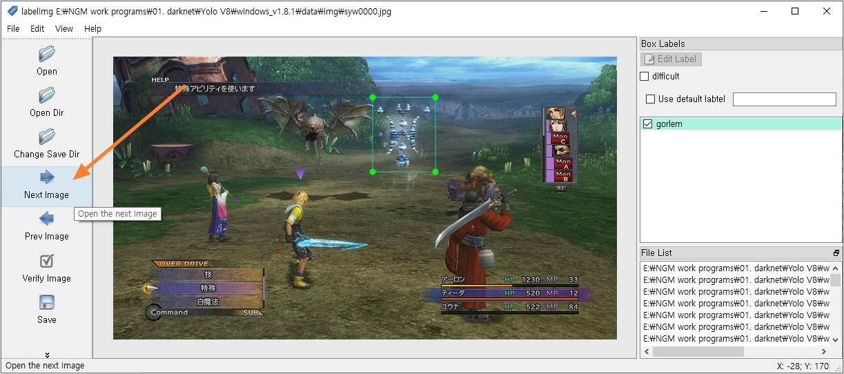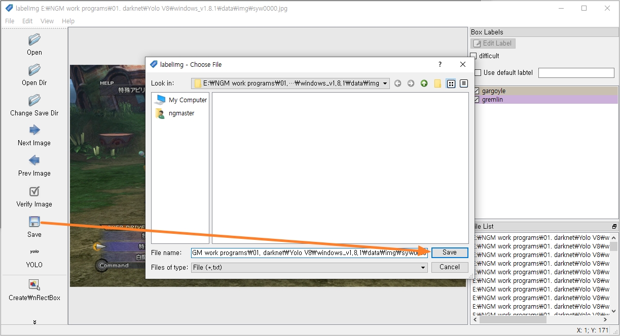 한장의 이미지에서 딥러닝할 모든 몬스터의 박스를 그려주고 이름을 선택했다면 저장해야 합니다.