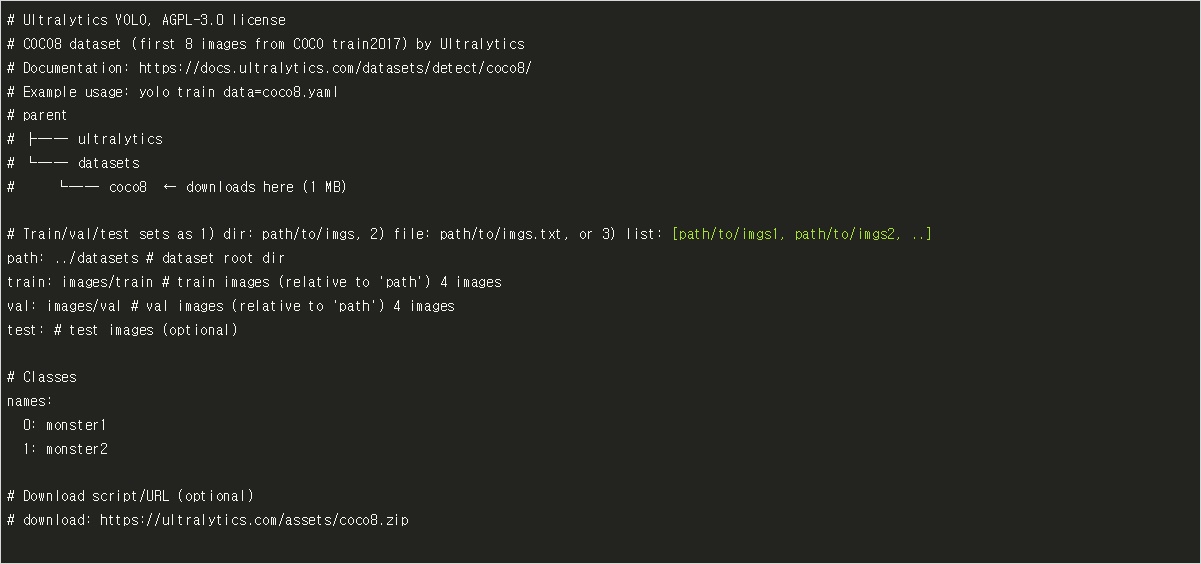 - 아래 내용에서 path, train, val의 경로는 자신의 환경에 맞게 수정해야 합니다. 99프로 에러나는 이유는 경로 문제입니다.