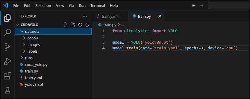 Visual Studio Code에서 새 파일을 추가하고, train.yaml 로 저장하세요.