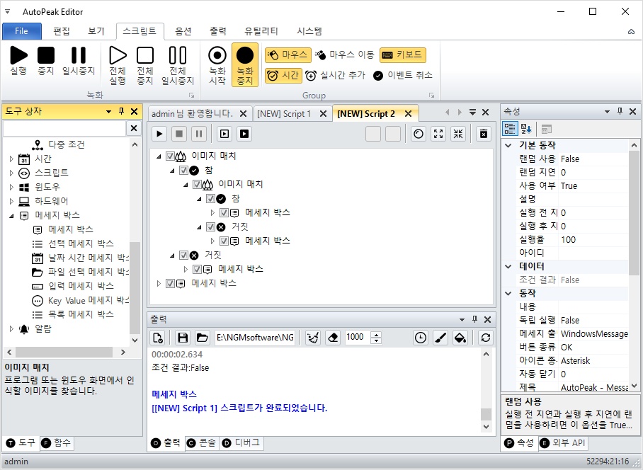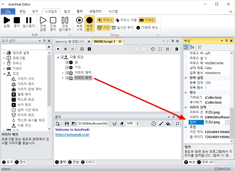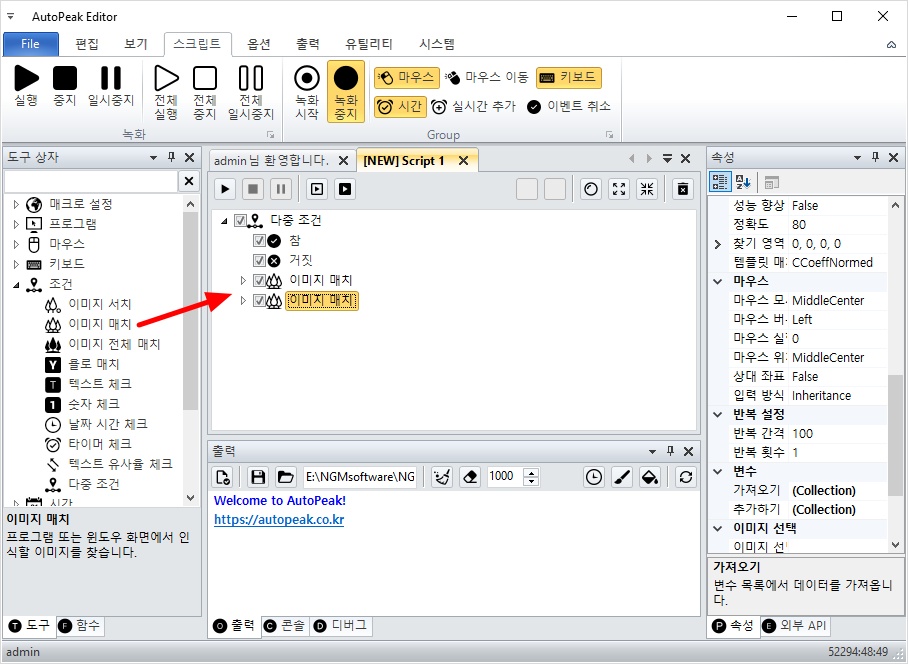 아래 그림과 같이 이미지 매치는 각각 조건 1.png와 조건 2.png 이미지가 선택되어 있습니다.