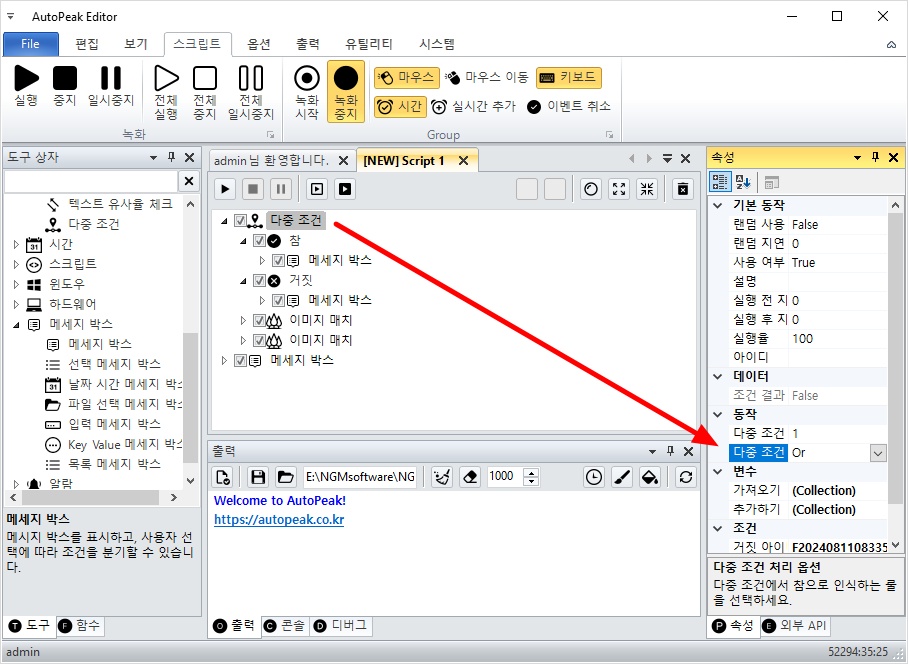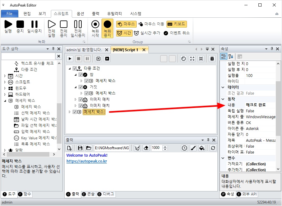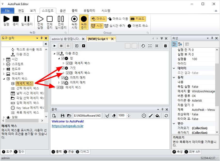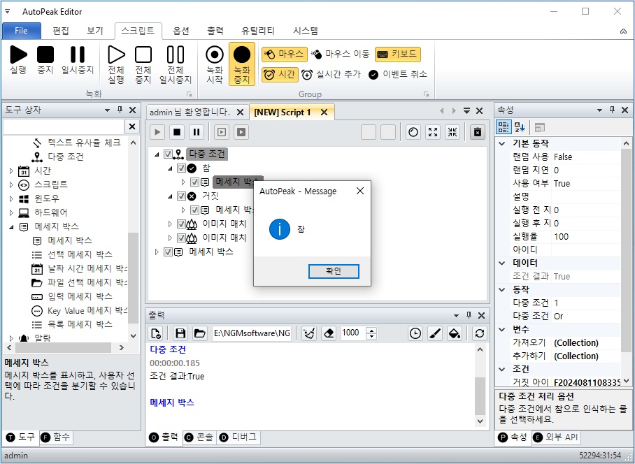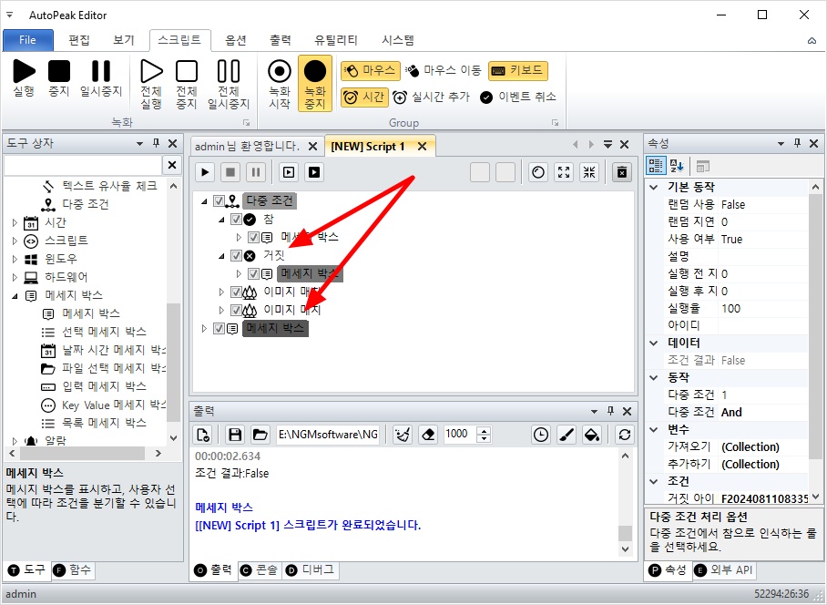따라서, 다중 조건의 하위에 추가되어 있는 참과 거짓 액션안에 메세지 박스를 하나씩 추가할께요.