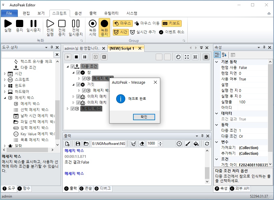 이번에는 다중 조건의 거짓으로 루틴이 이동하여 메세지 박스가 실행되었고, 마지막 메세지 박스로 이동해서 매크로가 완료되었습니다.