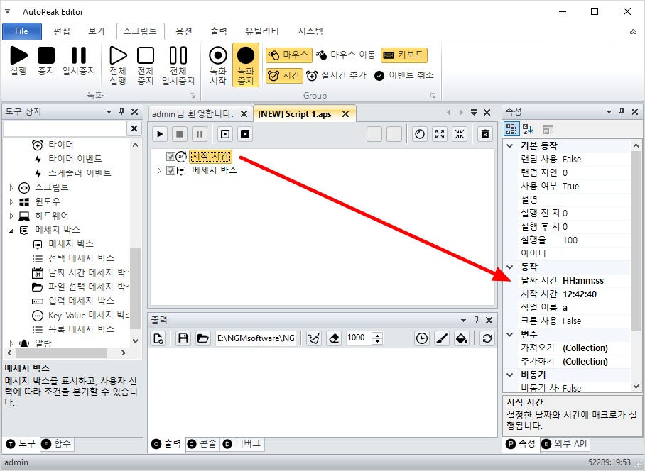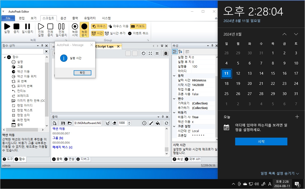 시작 시간에 동작하는지 확인하기 위해 메세지 박스도 하나 추가할께요.