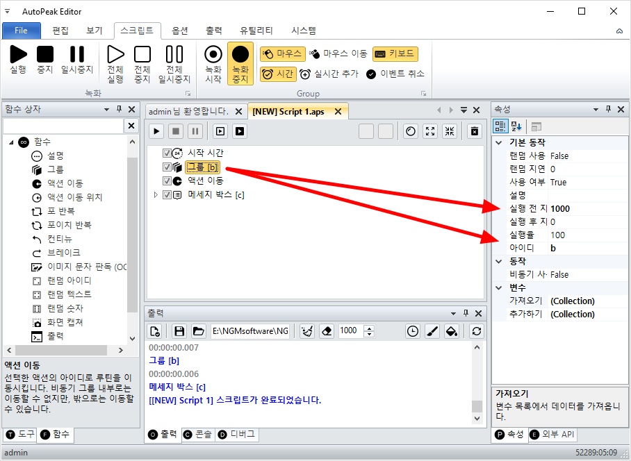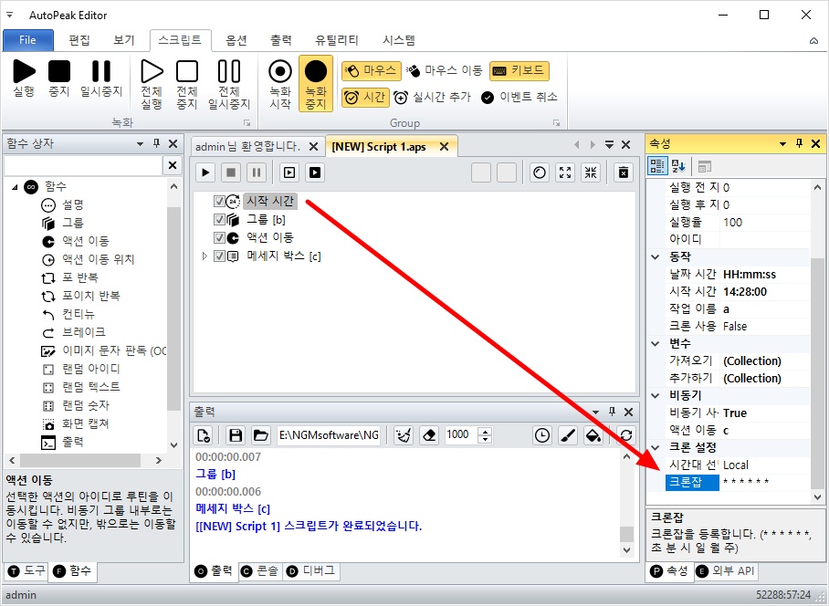 그리고, 시작 시간 액션을 더블 클릭해서 스크립트에 추가해줍니다.