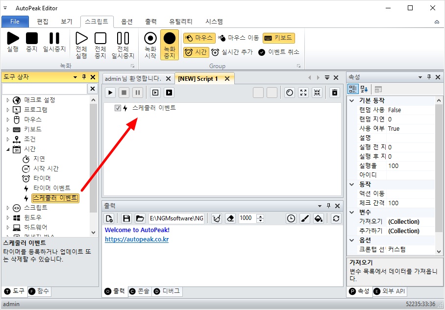 그 안에 있는 스케줄러 이벤트를 더블 클릭해서 새 스크립트에 추가 해줍니다.