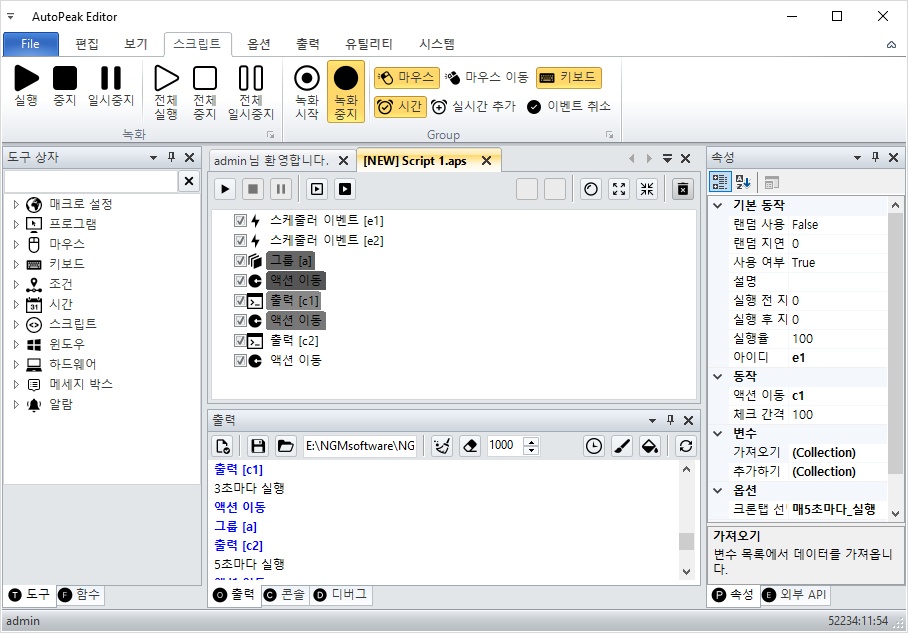 ※ 그룹과 액션 이동은 에디터의 좌측 하단 함수 상자에 있습니다.