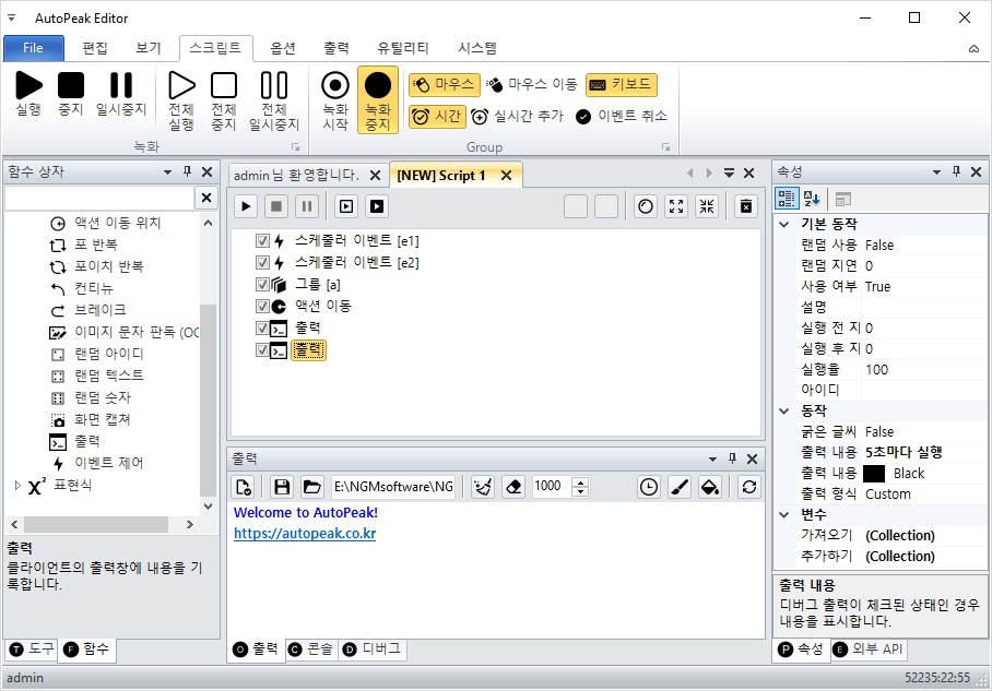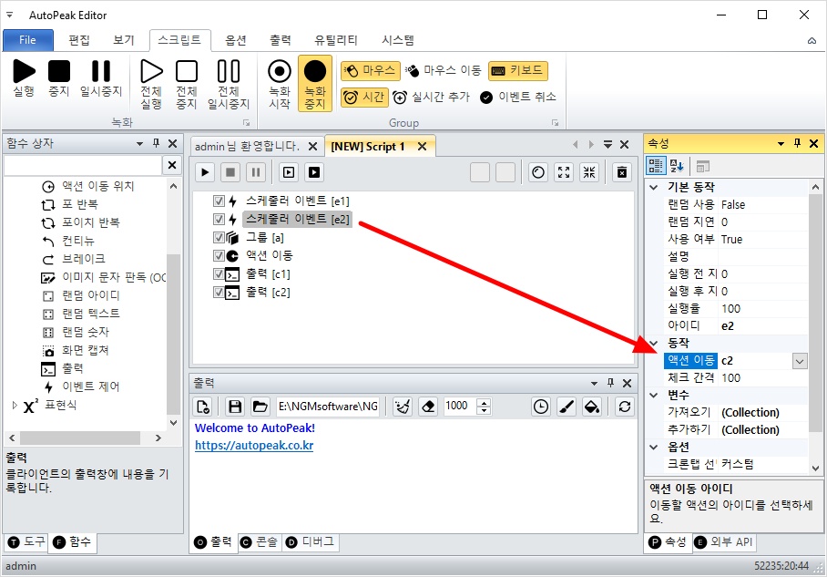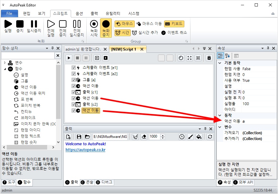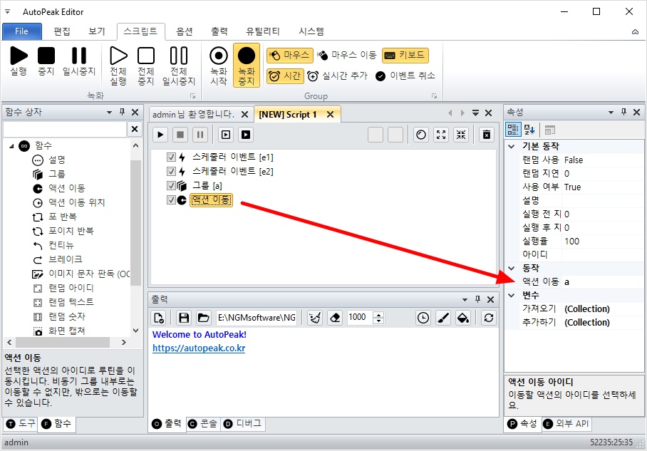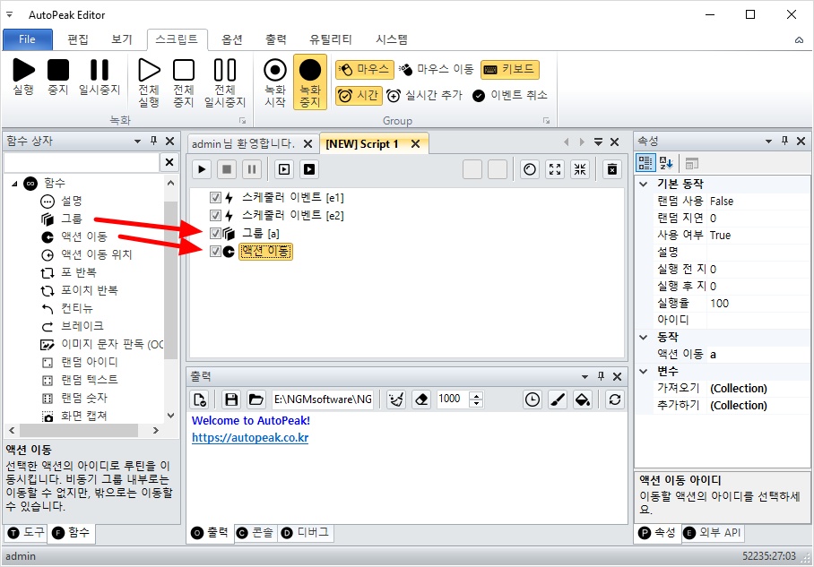 ※ 그룹과 액션 이동은 에디터의 좌측 하단 함수 상자에 있습니다.