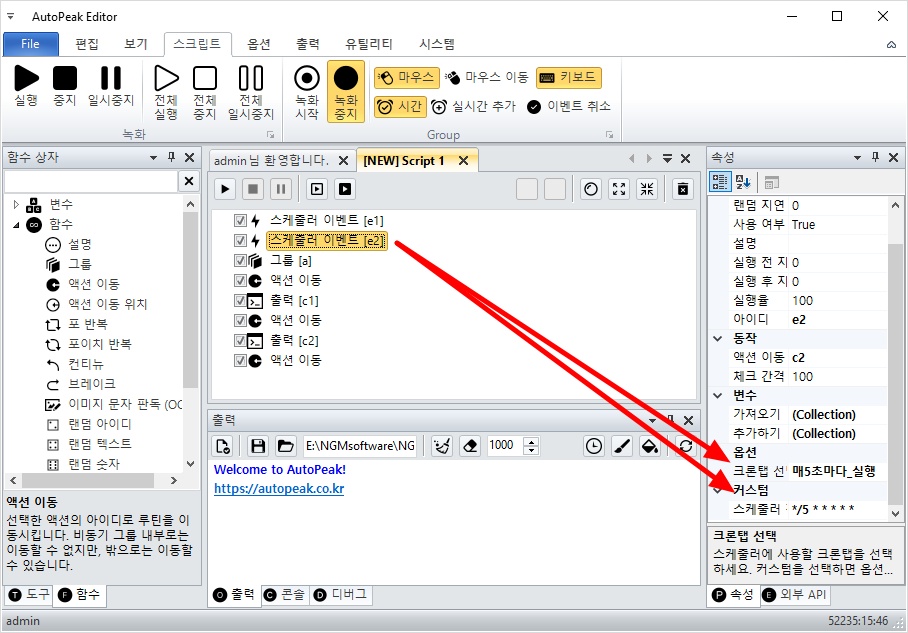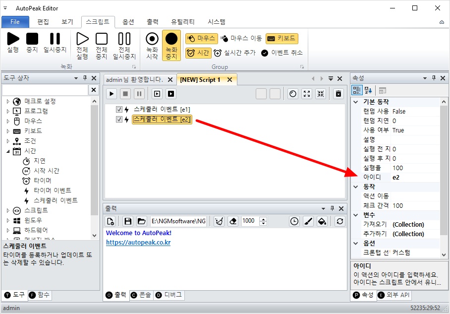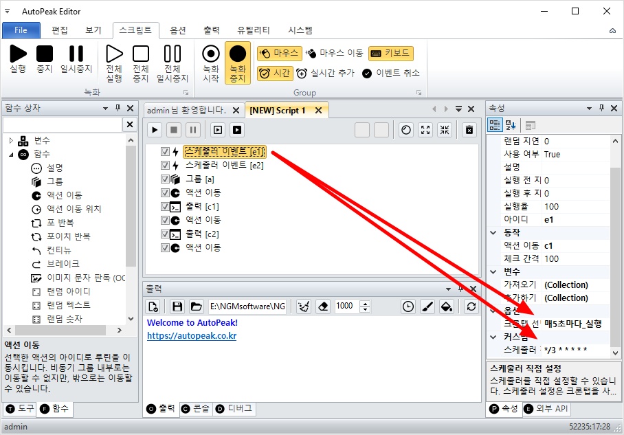 그 안에 있는 스케줄러 이벤트를 더블 클릭해서 새 스크립트에 추가 해줍니다.