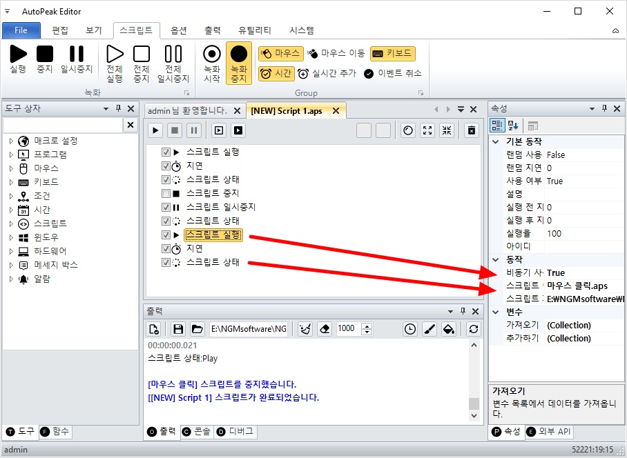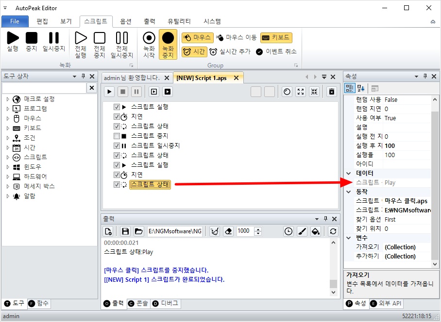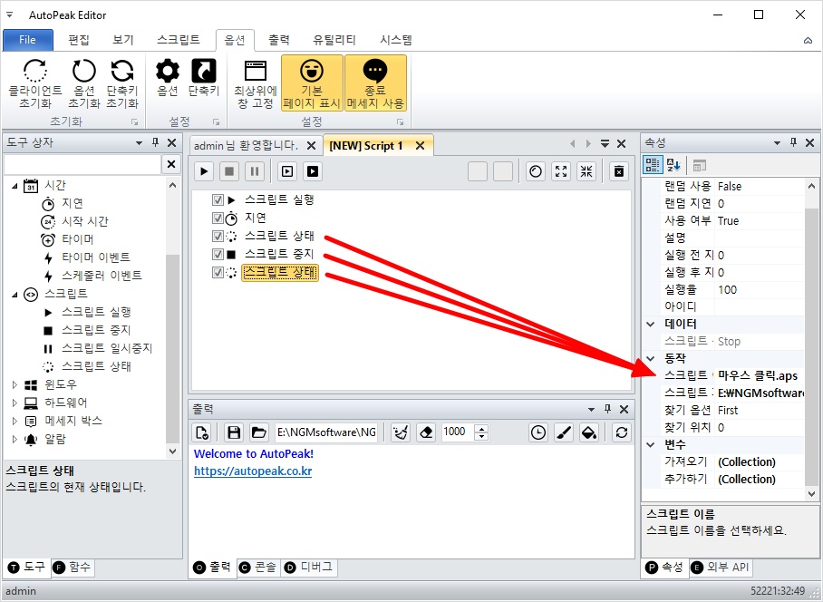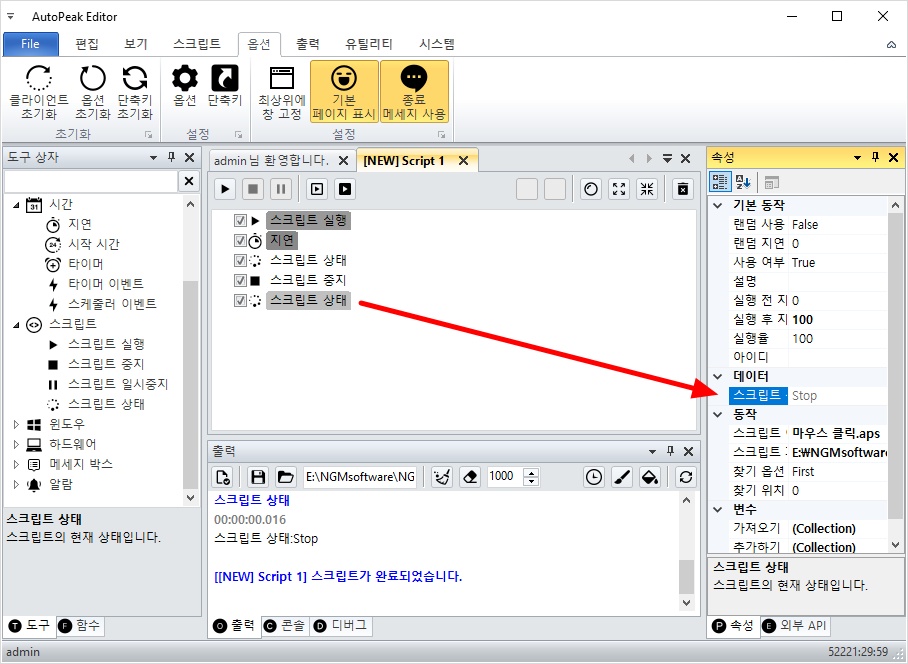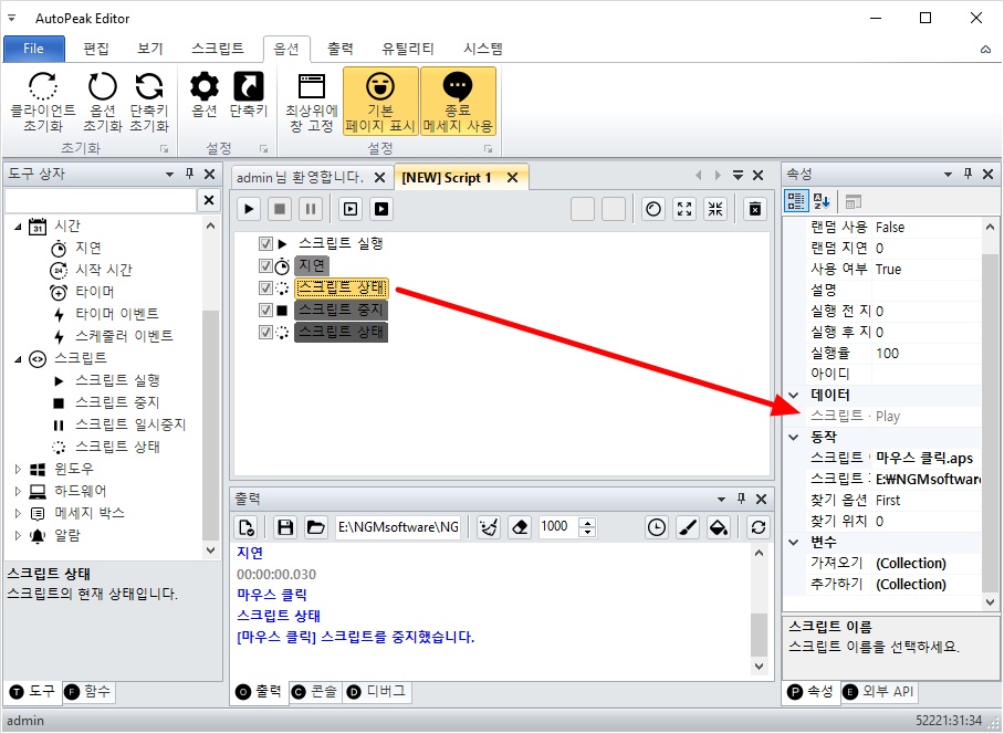오토픽 에디터를 실행하고, 좌측 하단의 도구 상자를 클릭하고 아래와 같이 스크립트 실행 액션을 추가하세요.