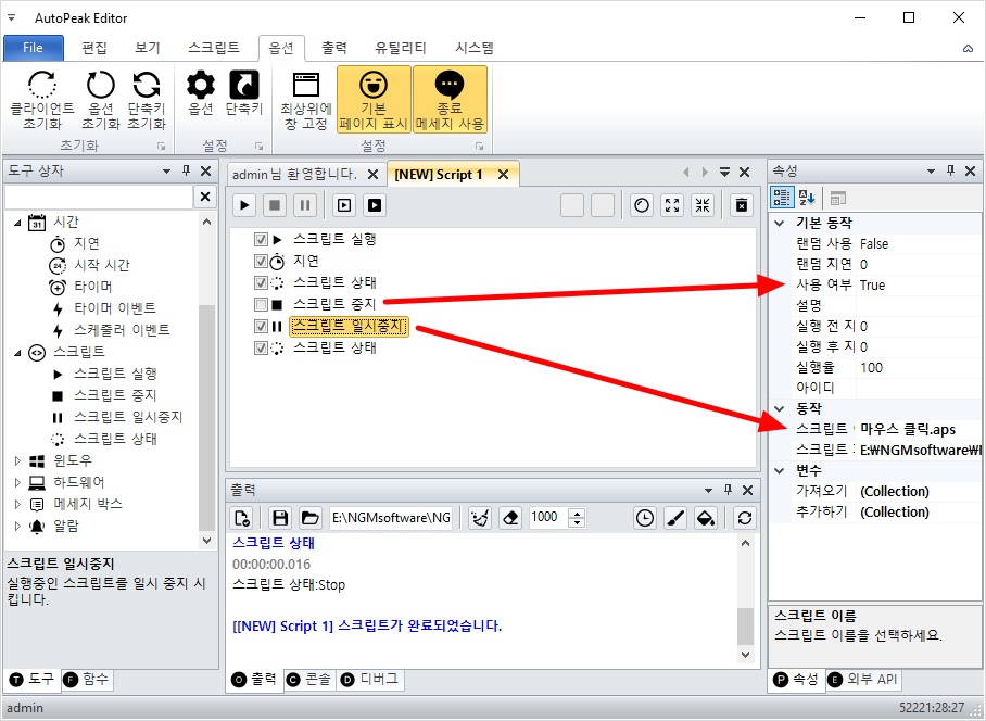 스크립트 중지와 일시중지는 스크립트 실행 액션으로 실행중인 스크립트를 로직에 따라서 중지하거나 일시중지할 수 있습니다.