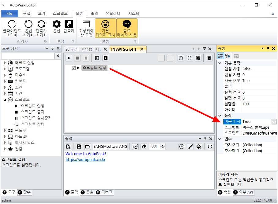 그리고, 이전에 만들었던 스크립트를 선택해줍니다. 우측 속성에서 비동기로 설정하세요.