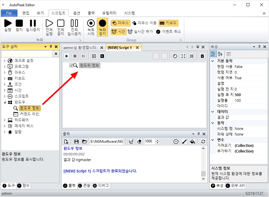 오토픽 에디터를 실행하고, 좌측 하단의 도구 상자에서 윈도우 정보 액션을 더블 클릭하세요.