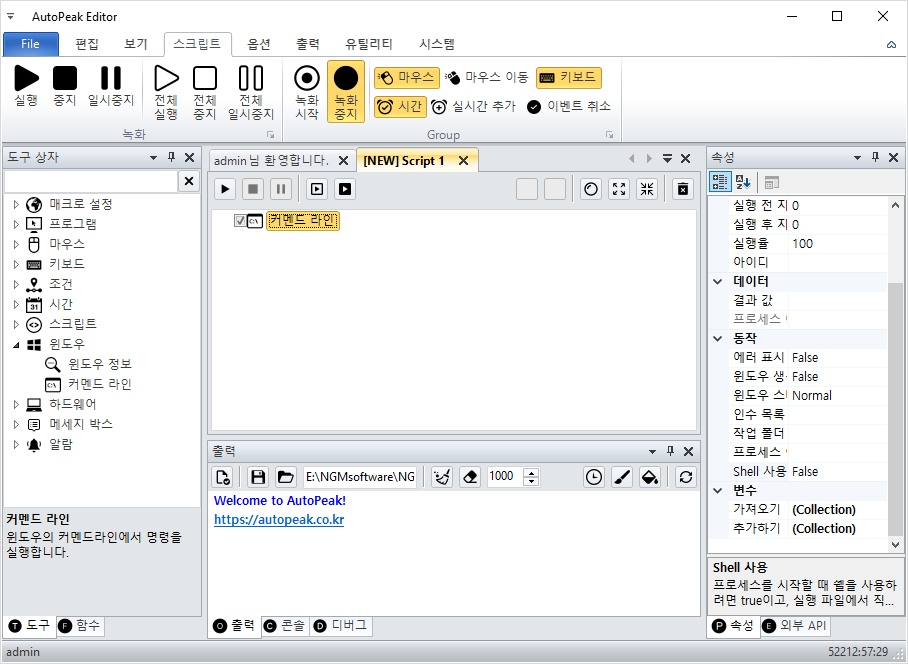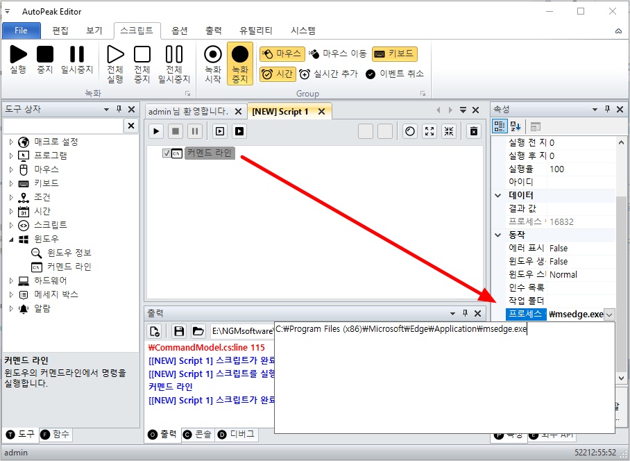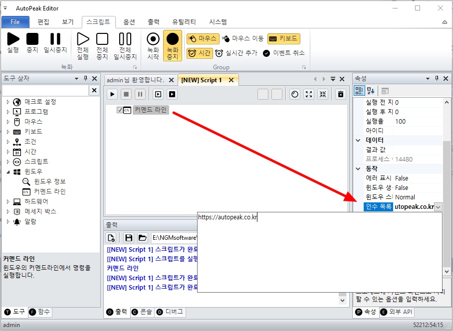오토픽 에디터를 실행하고 좌측 하단의 도구 상자에서 윈도우 카테고리를 펼쳐보세요. 커멘드 라인을 더블 클릭해서 스크립트에 추가하세요.