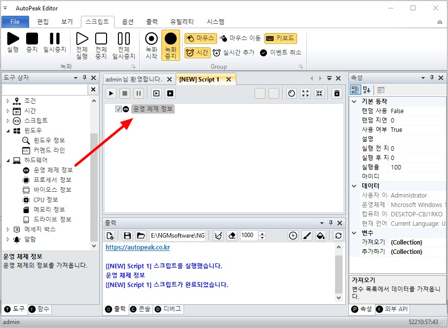 오토픽 에디터를 실행하고 좌측 하단의 도구 상자에서 하드웨어 카테고리를 펼치고 운영 체제 정보를 더블 클릭하세요.